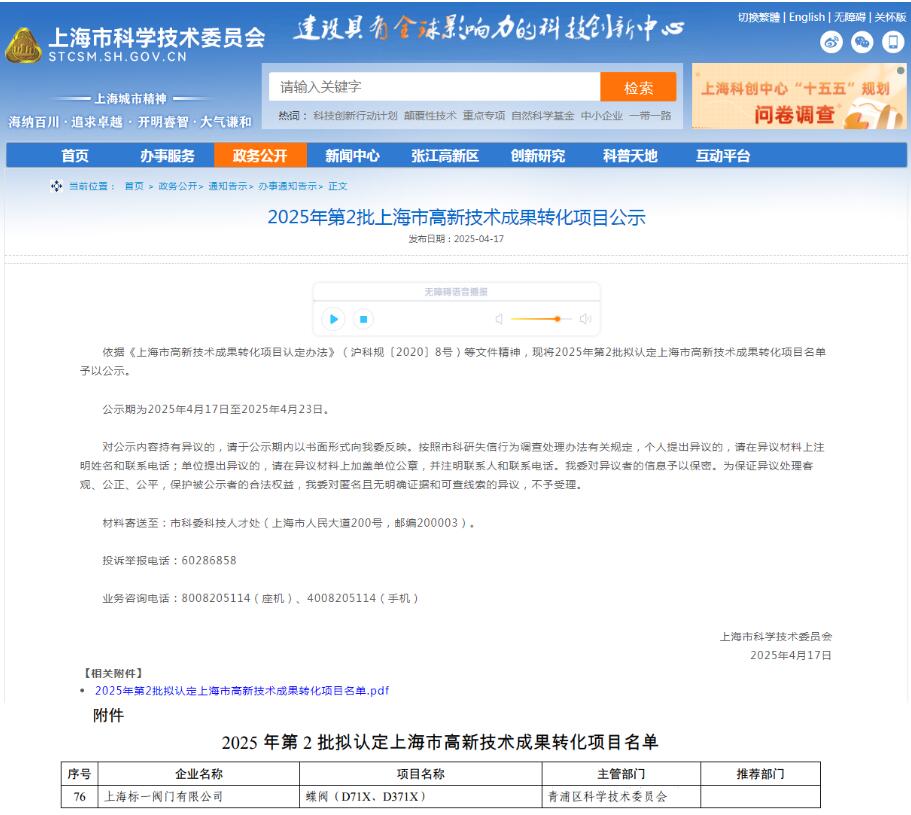 近日,上海市科学技术委员会公布2025年第2批上海市高新技术成果转化项目,青浦区8家企业的9个项目成功入选,其中上海标一阀门有限公司凭借阀门技术领域的创新实力脱颖而出,为区域高新技术发展注入新动能。
