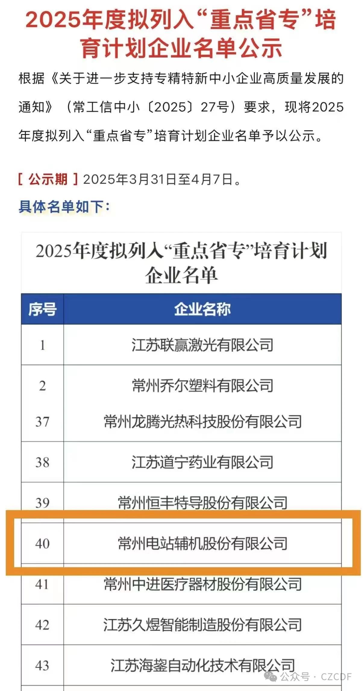 近日,2025年度“江苏省重点专精特新中小企业”(以下简称“重点省专”)培育计划名单发布,常州电站辅机股份有限公司赫然在列。这不仅意味着我公司成功斩获江苏省专精特新中小企业的荣誉称号,更标志着我公司成功跻身重点省专培育计划的行列,开启了企业高质量发展的新篇章。