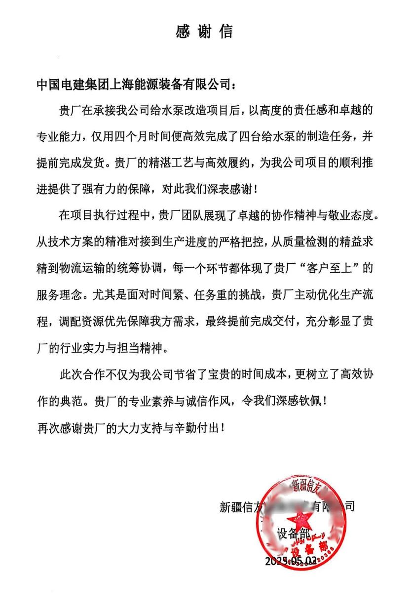 近日,上海装备公司凭借卓越的专业能力和高效的履约精神,圆满完成了新疆信友公司的给水泵改造项目,且提前完成设备发货,赢得了客户高度认可,并收到来自对方的感谢信。