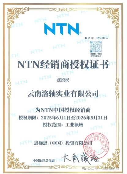 近日,云南洛轴实业有限公司传来喜讯,成功取得NTN 2025年度-2026年度授权经销商证书!这一荣誉的获得,不仅是NTN对云南洛轴过去合作的高度认可,更是双方未来携手共进的新起点。