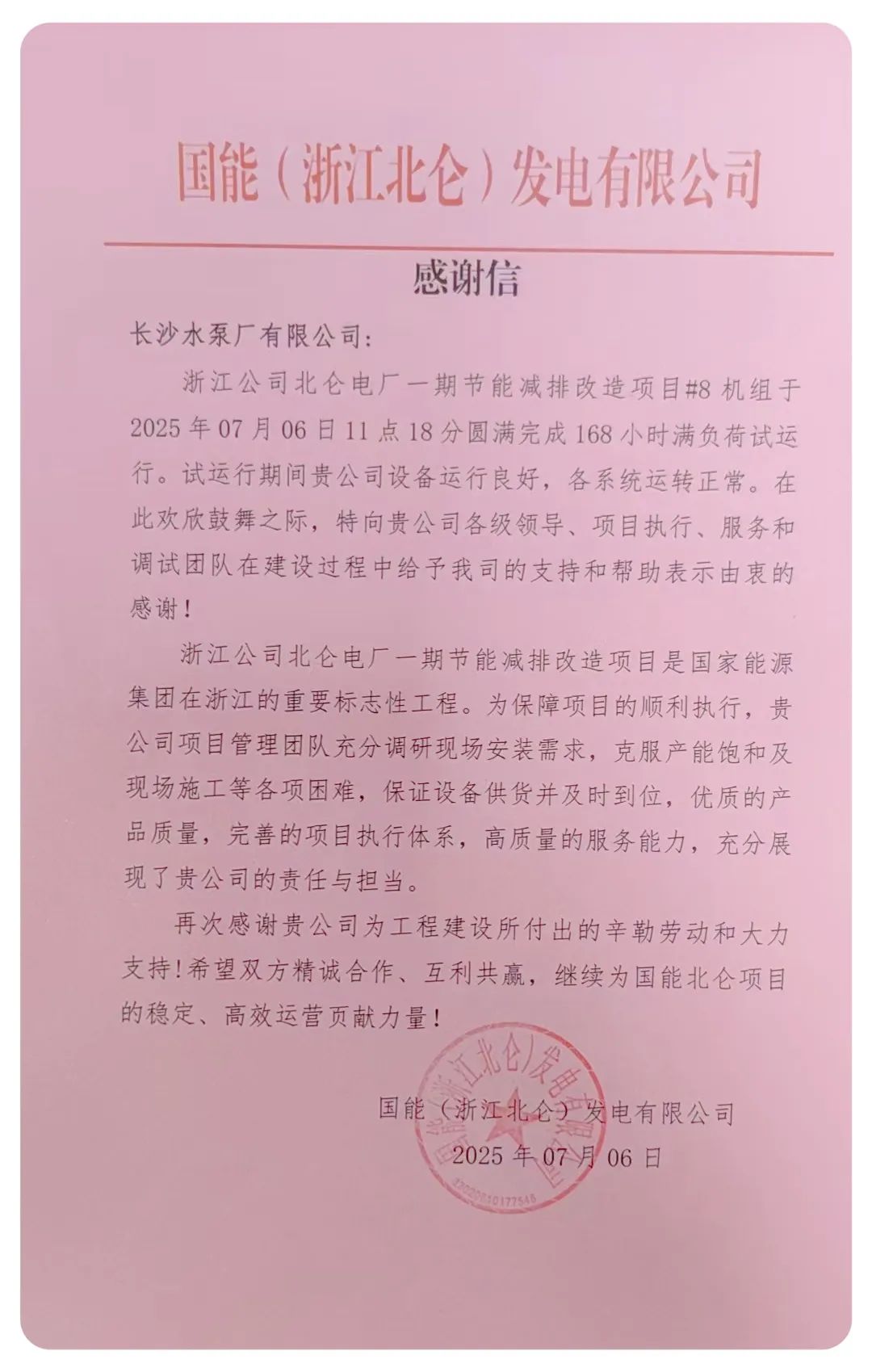 近日,长泵公司收到来自国能浙江北仑电厂的感谢信,信中高度赞扬了公司在项目合作中所展现出的专业精神和技术实力。国能浙江北仑电厂表示,在项目推进过程中,公司团队积极响应、密切配合、克服困难,按时完成了各项任务,针对电厂的特定需求提供了创新性的解决方案,此次合作不仅加深了双方的业务联系,更为未来更多的合作奠定了坚实的基础。
