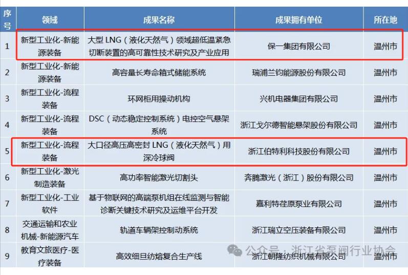 近日,浙江省科技厅根据省政府关于推动大规模设备更新和消费品以旧换新的总体部署和《浙江省推动大规模设备更新和消费品以旧换新科技攻关实施方案》要求,从科技攻关成果中梳理出2025年第一批76项“两新”领域重大科技成果,保一集团有限公司研制的大型LNG(液化天然气)领域超低温紧急切断装置、浙江伯特利科技股份有限公司开发的大口径高压高密封LNG(液化天然气)用深冷球阀等2项成果分别入选。