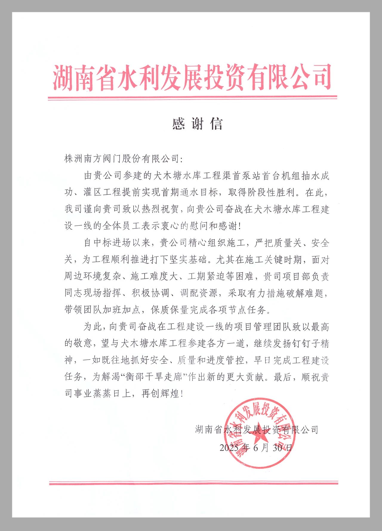 6月30日,资江水经犬木塘水库渠首泵站加压奔腾入渠,标志着国家重大水利工程——犬木塘水库工程正式实现首期通水目标,作为湖南省装机容量较大的提水泵站,湖南省单体较大的灌区示范项目,犬木塘渠首泵站堪称水利工程领域的 “心脏”。未来,它将以年均3.2亿m3的输水量,为饱受干旱困扰的 “衡邵干旱走廊” 注入生命源泉。南方阀门产品凭借先进的技术工艺与稳定的性能优势,为输水系统的安全平稳运行提供了坚实保障,助力湖南水利建设新篇章。