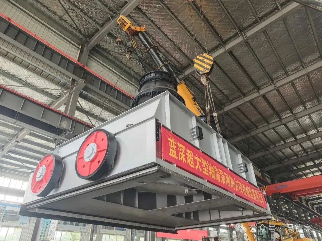 当各巨型部件如龙骨般准备就绪,总装犹如一场静默的仪式。数百个高强螺栓孔需精准对位,误差须控制在0.5毫米内。装配师傅们借助激光校准仪,凭借丰富经验不时微调着数十吨构件的姿态,直至严丝合缝。巨大的吊臂在空中沉稳移动,每一次起落都牵动人心,最终,泵与闸门体如榫卯般完美贴合。这台“巨无霸”的震撼问世,是蓝深产品发展史上的一个重要的里程碑,是蓝深放眼全球,不断创新,不断超越的完美诠释。