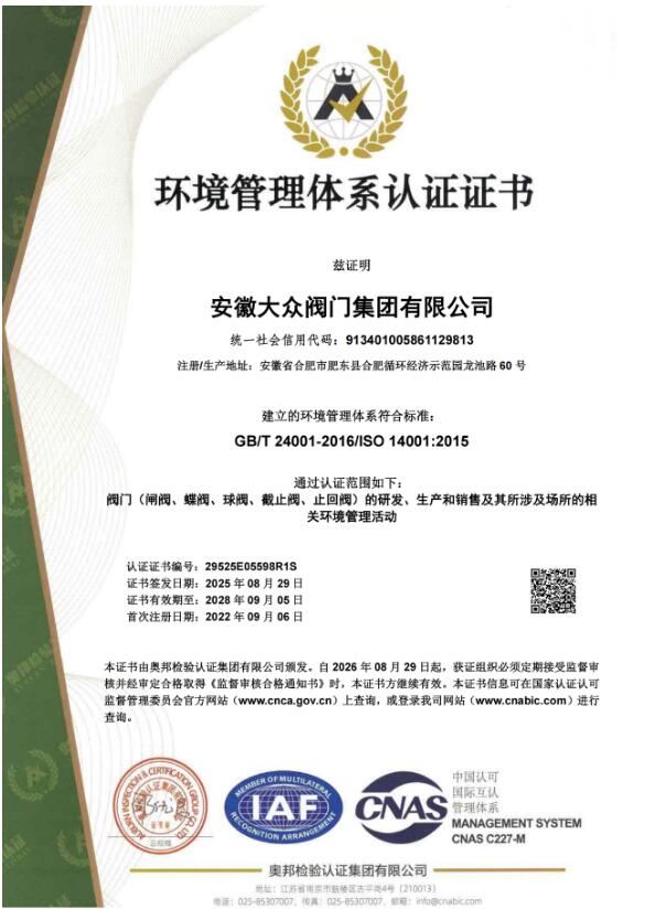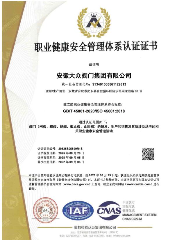 近日,安徽大众阀门集团顺利通过职业健康安全管理体系(ISO45001)与环境管理体系(ISO14001)的再认证审核,这一成果标志着公司在员工职业健康保障、环境保护以及可持续发展战略实施方面的卓越成效与坚定承诺。