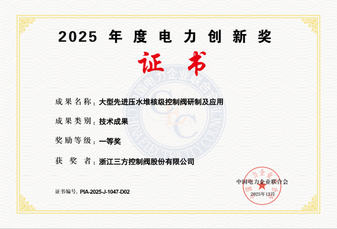 近日,2025年度电力创新奖获奖名单正式公布,浙江三方控制阀股份有限公司“大型先进压水堆核级控制阀研制及应用”,荣获中国电力企业联合会颁发的2025年度电力创新一等奖。