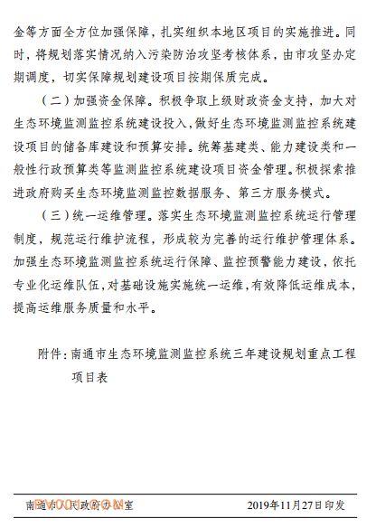 《南通市生态环境监测监控系统三年建设规划(2019~2021年)》已经十五届市政府第44次常务会议讨论通过,现印发给你们,请结合实际认真组织实施。