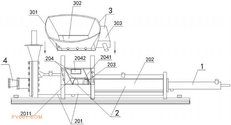 闸阀基座、浆料推送柱头,导向推杆的一端与动力驱动装置连接,另一端与浆料推送柱头连接,导向推杆和浆料推送柱头整体穿装在闸阀基座的内部,所述闸阀基座有侧向开口区域,进料口斗装置固定安装闸阀基座中侧向开口区域的上顶面,其特征在于,所述浆料推送柱头有前推送柱头、密封环垫和防裂后柱头,所述侧向开口区域的侧面有两个闸门。本实用新型能够自动定量推送浆料,节能环保兼备自润滑,有效防止柱头上面产生热裂纹,密封效果好。