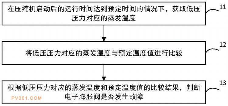 专利摘要:公开(公告)日:2019-11-26摘要:本公开涉及一种电子膨胀阀故障诊断方法和装置、空调和存储介质。该电子膨胀阀故障诊断方法包括:在压缩机启动后的运行时间达到预定时间的情况下,获取低压压力对应的蒸发温度;将低压压力对应的蒸发温度与预定温度值进行比较;根据低压压力对应的蒸发温度和预定温度值的比较结果,判断电子膨胀阀是否发生故障。本公开可以通过低压压力对应的蒸发温度与预定温度值比较,判断电子膨胀阀的动作是否正常,从而实现对机组元器件运行情况的监控,保证机组运行良好。