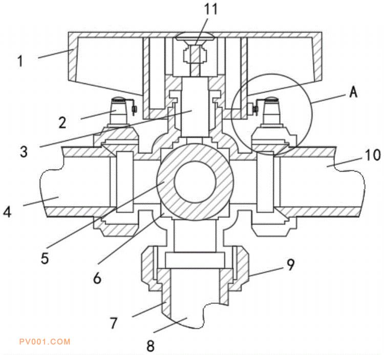 阀门旋钮下方连接三通阀阀门旋钮,三通阀阀门旋钮顶部设有螺纹孔,三通阀阀门旋钮内部设有旋钮固定螺栓,三通阀阀门旋钮通过旋钮固定螺栓与三通阀阀门旋钮顶部的螺纹孔连接,三通阀阀门旋钮底部连接