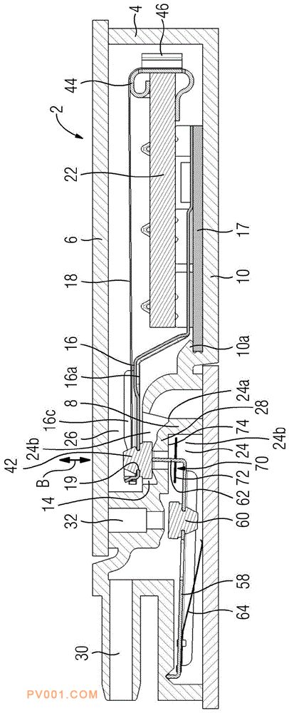 专利摘要:公开(公告)日:2019-11-26摘要:本发明涉及阀和阀装置,阀(2)有阀壳体(4),其包括壳体盖(6)、壳体底部(10)和布置在壳体盖(6)和壳体底部(10)间的中间壳体(8),其中阀壳体(4)包围包括流动室(24)和致动室(26)的阀室(12),其中阀壳体(4)有从流动室(24)通向致动室(26)的至少一阀开口(14)且至少一执行元件(16)、由形状记忆合金制成的丝线状或带状SMA元件(18)及电路板(22)布置在致动室(26)内,执行元件可在闭锁阀开口(14)的闭合位置与开启阀开口(14)的打开位置间移动,执行元件在第一端有阀元件且在第二端与阀壳体和/或基板连接,SMA元件用于在打开方向致动执行元件(16),其中SMA元件(18)通过中间部分(18c)固定到执行元件(16)并通过其端部(18a、18b)与电路板(22)电连接以被施加电流,其中SMA元件(18)在中间部分(18c)U形弯曲,其中阀包括控制器(58)。