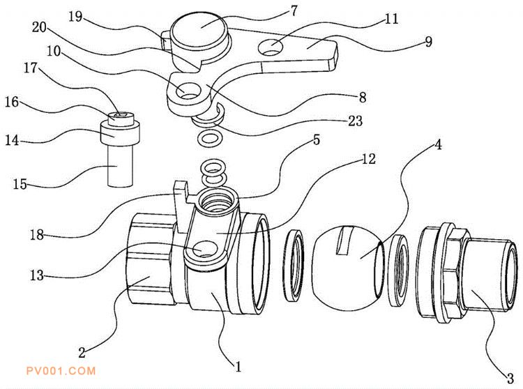 球阀容易被人误开误关的问题。本球阀包括阀体,阀体上具有进水管接头、出水管接头,进水管接头和出水管接头呈轴向分布且该两者相互连通,阀体内设置有阀芯,阀体上还设置有阀座,阀座内穿设有与阀座密封配合的阀杆,阀杆的下端与阀芯连接,阀杆的上端伸出所述的阀座且该上端端部具有能带动阀杆周向旋转的手柄,手柄和阀座之间设置有能将手柄固连在阀座上防止手柄周向旋转的锁定装置。本实用新型结构设计合理、主要是将手柄周向旋转限位,要用专门的钥匙才能将防盗螺栓打开使手柄周向旋转,不会轻易被人误开误关。