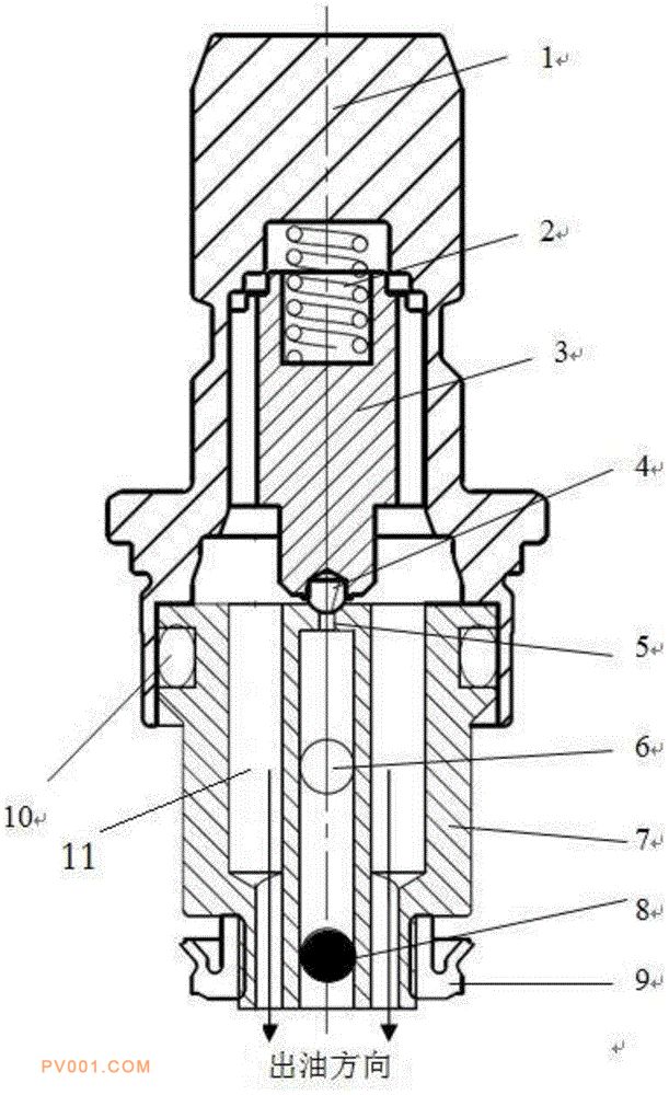 电磁阀,线圈套在阀体上,包括阀体、预紧弹簧、动铁、钢球、球座、出油油路、进油油路、阀座和封堵钢球,所述阀体与阀座密封连接,阀体内部中空,阀体内部底部连接预紧弹簧,动铁底部中央开孔并通过该孔与预紧弹簧连接,动铁顶部中央开孔并通过该孔容纳钢球;阀座内部中央开设两端开口的中通道,中通道上端开口为球座,球座直径小于钢球直径并且设置有锥面,球座通过锥面与钢球配合,中通道侧面与进油油路连通,进油油路与外部连通,封堵钢球位于中通道下端出口并且与中通道密封连接,在阀座内部的中通道外围开设两端开口的出油油路,出油油路与外部连通。