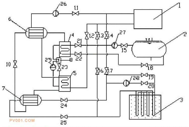 水泵等部件。由上述部件组成水循环环路、吸收式热泵环路、热泵供暖环路以及冷水循环环路。本发明的供暖系统实现了利用夜间电价低的优势将电能转化为高压水箱中的热能存储起来,冬季可利用高压水箱向用户供暖或者驱动吸收式热泵,利用吸收式热泵向用户供暖;夏季可利用地源热泵向用户供冷。本发明的供暖系统充分利用低谷电价的政策的优势以及溴化锂吸收式热泵和地源热泵的特点,实现了供暖与制冷的双重需求,同时也提高了用户生活的舒适性,并有利于节约资源保护环境。