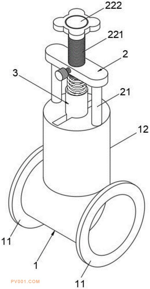 闸阀,螺杆在第一螺孔内向下伸进的过程中挤压伸缩杆,使得伸缩杆向通孔内伸进,止流盘也随之在密封槽内向下伸进,当止流盘伸入输液管内部时,止流盘对输液管管道内壁进行遮挡,遮挡面积越大,流体的流速越慢,遮挡面积越小,流体的流速越快,解决手动单夹式刀形闸阀不便于控制流体流速的问题。