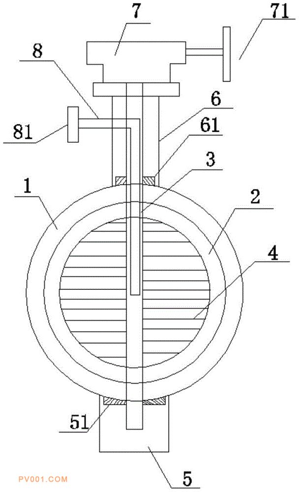 蝶阀,包括阀体、阀板、阀板密封圈、阀杆、底座、上连接管、蜗轮头和手轮,所述阀板的两侧由内向外均分别设置有充气层和外板层,所述阀板和外板层的外沿通过充气橡胶相连,所述阀板、外板层和充气橡胶形成充气层,所述阀杆为空心结构且内部设置有充气管,所述充气管的进气口延伸出阀杆和上连接管,所述充气管的底部设置有均气管,所述均气管的两端穿出阀杆分别连通着两个充气层用于充气。本实用新型通过充气层的设置并且利用充气橡胶自身的弹性伸缩功能,能够利用充气的方式通过充气橡胶有效的解决因为空隙出现的漏液问题,从而保证了对夹