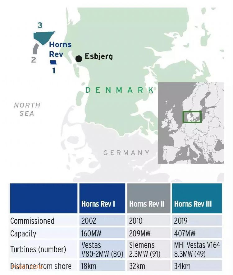 2019年初投产的Horns Rev 3则采用了当今最大的海上机组之一——MHI Vestas V164-8.3MW,转子直径达164米,是Horns Rev 1风场机组的2倍还多,轮毂高度上升到105米。风功率密度393W / m2,位于离岸34公里,水深20米的海域。