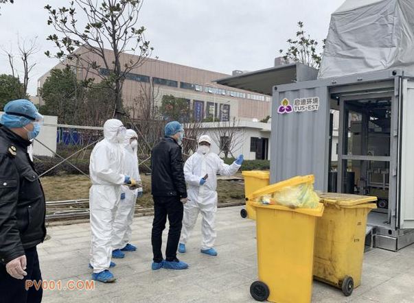 图为从山东紧急调来的应急设备,就安装在雷神山临时医疗点附近的武汉协和江南医院院内,已经调试好,并开始运行,确保医疗废弃物及生活垃圾得到无害化处理。