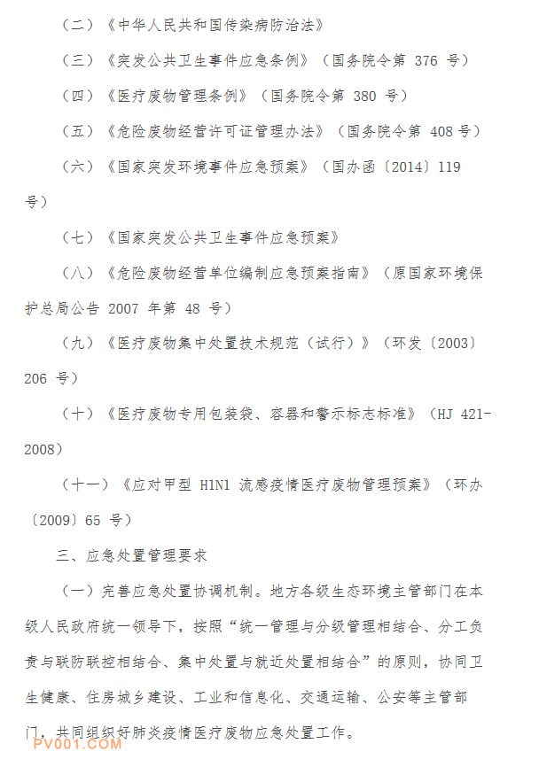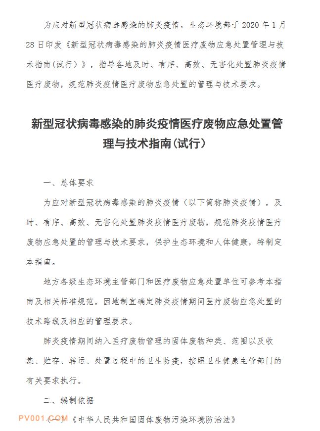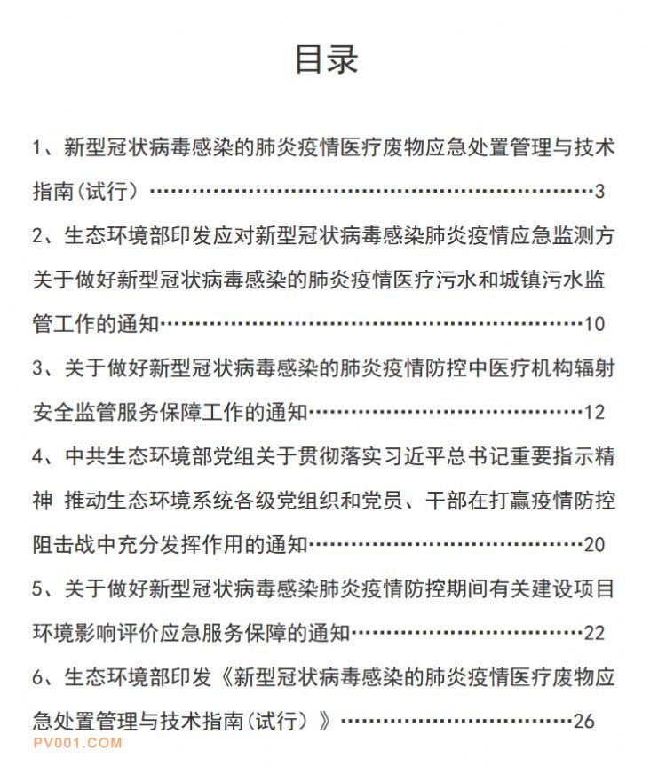 新型冠状病毒感染的肺炎疫情发生以来,生态环境部深入贯彻落实习近平总书记重要指示批示精神和党中央、国务院决策部署,于近期出台了多项应对新型冠状病毒肺炎疫情的相关环保政策措施,科学指导各地政府及相关企业及时、有序、高效、无害化处置医疗废物。中国环境保护产业协会将相关政策汇集成册,形成《生态环境部应对新冠疫情政策汇编》(以下简称“政策汇编”,收录政策截止日期为2020年2月15日),供广大环保企业及各界人士参考。