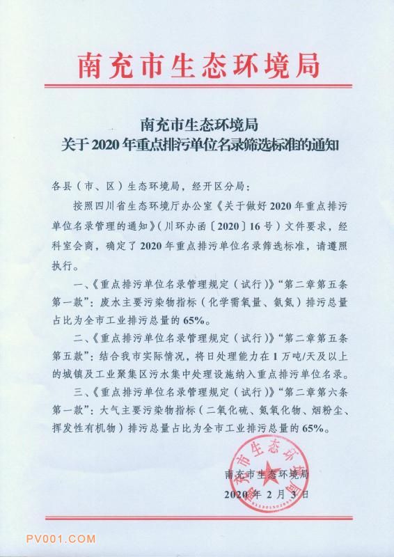 四川省南充市生态环境局关于2020年重点排污单位名录筛选标准的通知