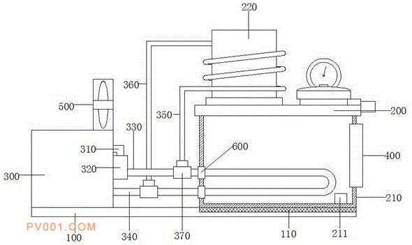 油泵冷却装置,其包括:底板、油泵、水冷装置、散热片和散热扇,所述底板顶部右侧设置油泵,所述油泵底部具有油箱,所述油泵顶部具有泵体,所述底板顶部左侧设置水冷装置,所述水冷装置右侧壁顶部连接有抽液管,所述抽液管连接有循环泵,所述循环泵右端连接有出液管,所述出液管伸入油箱内腔,所述出液管在油箱内腔折回形成回液管,避免油泵工作导致温度升高影响供油稳定性,通过散热片将油箱中的热量导出,达到降温效果,通过散热扇吹风将油箱和泵体外部聚集的热量吹散,降低油箱和泵体的升温速度,提高油泵使用寿命,避免温度过高损坏油泵内部电子元件。