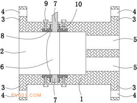 专利摘要:公开(公告)日:2020-04-21摘要:本发明公开了一种具有分腔缓冲功能的碟阀,包括阀体,所述阀体内部左侧的进水通道内通过转动杆连接有圆形阀板,所述阀体内部右侧还设有两组与进水通道连通的分流出水通道,所述圆形阀板上设有阶梯凹槽,所述阶梯凹槽包括用于插接橡胶密封环的底部凹槽和用于插入两组定位环的上部凹槽,所述转动杆的上端贯穿伸出阀体,所述转动杆的上下部均套入至T型套筒内部嵌入的轴承。本发明橡胶密封环的固定牢固稳定,液体流动对橡胶密封环进行冲击时,通过两组定位环对橡胶密封环的支撑作用,防止橡胶密封环在受到液体冲击时产生摇晃,这样可防止橡胶密封环摇晃造成密封性不佳的现象;有效防止转动杆位置倾斜造成圆形阀板卡在进水通道内。