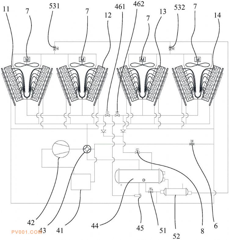 专利摘要:公开(公告)日:2020-04-21摘要:本实用新型公开了一种采用分布式除霜的风冷热泵系统,包括至少两个换热组,各换热组分别包括至少一翅片换热器;一制热管路;一制冷管路;一除霜管路;至少两个除霜阀;至少两个主液路阀,主液路阀与换热组一一对应,制热管路分别通过各主液路阀接入对应的换热组的各翅片换热器,制冷管路绕过各主液路阀分别接入各换热组的各翅片换热器。本实用新型采用换热组分布除霜,先满足除霜条件的一组翅片换热器可先进行除霜,且除霜期间机组正常制取热水运行,保证机组出水温度不出现明显波动;除霜期间压缩机吸排气压力无明显波动,保证磁悬浮压缩机可靠运行;制冷模式从壳管换热器中吸气,无吸气过热度,制冷量大制冷效率高。