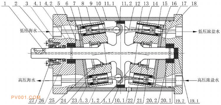 柱塞泵中的两对滑靴副。采用泵和马达在主轴转盘两侧布置的结构型式,泵端配流斜盘与低压海水入口、高压海水出口连通,马达端配流斜盘与低压浓盐水出口、高压浓盐水入口连通。工作时电机驱动液压泵吸入原料海水并增压,产生的高压海水经反渗透膜过滤变成高压浓盐水进入液压马达,完成能量回收过程后通过低压浓盐水出口排出。本发明克服了现有能量回收装置集成度低、摩擦副数量较多和盐/海水存在掺混等缺点,具有能量回收效率高、无掺混和工作寿命长等明显技术优势。