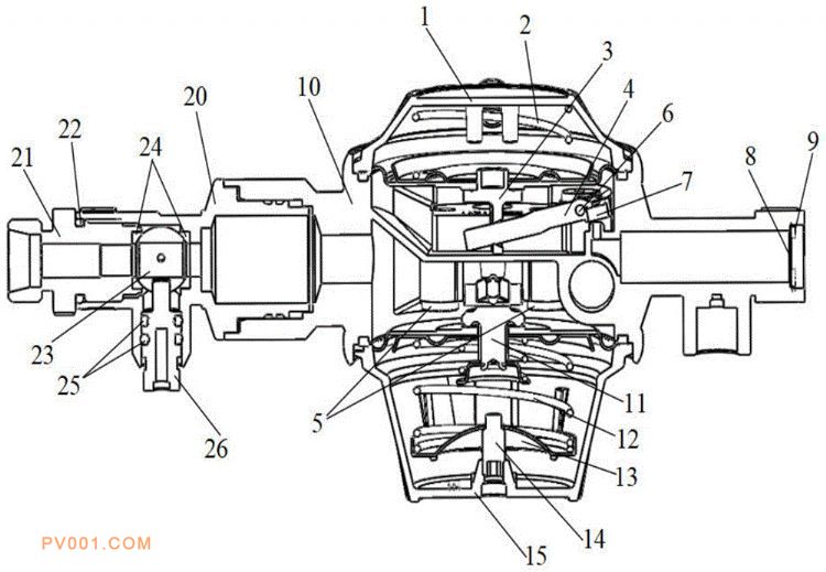 减压阀与打压阀组合式阀,低压阀杆轴16穿入低压阀杆18,低压单路密封垫17装在低压阀杆18上,低压阀杆轴16用二枚内六角圆柱头螺钉5固定在单路