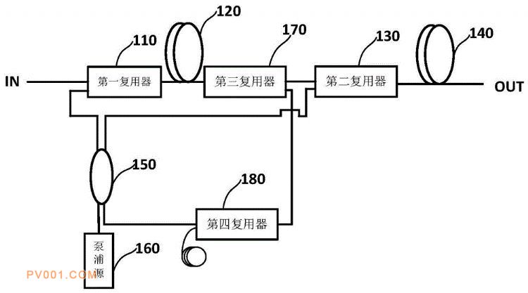 专利摘要:公开(公告)日:2020-04-17摘要:本发明提供一种光纤放大器的泵浦光回路结构,包括:第一复用器的信号端接信号输入端IN,公共端接第一铒纤一端;第一铒纤另一端接第三复用器的公共端,第三复用器的信号端接第二复用器的信号端,第二复用器的公共端接第二铒纤一端,第二铒纤另一端接信号输出端OUT;泵浦源接泵浦分光器的一个泵浦端,泵浦分光器的两个分光端分别接第一复用器的泵浦端、第二复用器的泵浦端;第三复用器的泵浦端接第四复用器的公共端,第四复用器的泵浦端接泵浦分光器的另一个泵浦端;第四复用器的信号端接绕数圈小圈的光纤。本发明可以提高泵浦利用效率,获得更高的输出。