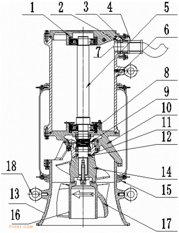 潜水泵技术领域,尤其超轻型大流量潜水轴流泵,其包括电机壳、电机安装座、油室座、叶轮、导流装置及滤网,电机安装座及油室座之间通过轴承安装有电机轴,电机轴在油室座内设有机械密封,油室座下方固定安装有油室端盖,叶轮安装于电机轴的下端部,导流装置包括固定安装于油室座下方的导流罩、与导流罩固定连接的导叶连接套及均匀的固定设于导叶连接套上的多个导叶,每个所述导叶包括与导叶连接套相固定贴合的连接部及倾斜设置的导流部,滤网为两侧分体式结构并通过蝶形螺母固定组装,滤网的上下两端通过喉箍固定套装于电机壳及油室座外。本实用新型提供的装置导流效果好,流量及压力比较大。