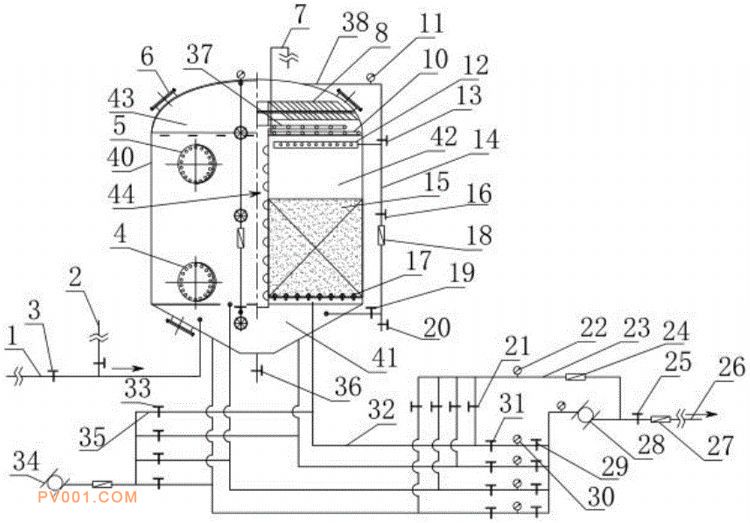 阀门,混合仓与总进水管连通,水力絮凝通道的上部通过沉淀配水管与沉淀分水仓连通,水力絮凝通道的下部与混合仓连通,沉淀分水仓内设有若干个沉淀配水管,沉淀分水仓的底部设有虹吸排泥支管以及与虹吸排泥支管连通的虹吸排泥干管,虹吸排泥干管垂直贯穿筒体的上端,沉淀分水仓顶部连接有分水管,分水管分别与滤仓布水器与混合仓连接,过滤仓包括位于上部的滤仓布水器、位于下部的集水装置以及位于两者之间的滤床,集水装置与