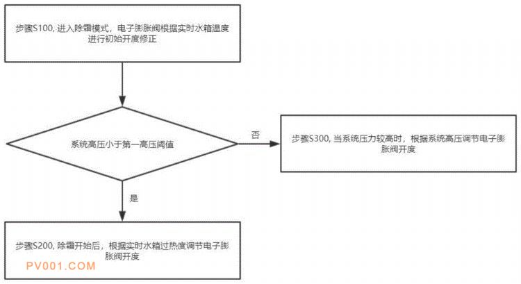 专利摘要:公开(公告)日:2020-05-08摘要:本发明提供一种电子膨胀阀的控制方法、控制装置和热泵热水机,热泵热水机在除霜时根据水箱温度智能判断电子膨胀阀除霜初始步数,之后根据水箱过热度进一步精确调节电子膨胀阀步数,又系统压力区间对电子膨胀阀调整,确保了不同初始水温下,热泵热水机除霜的可靠及节能;所述控制方法,用于热泵热水机的除霜模式中,包括以下步骤:进入除霜模式,电子膨胀阀根据实时水箱温度进行初始开度修正;除霜开始后,根据实时水箱过热度调节电子膨胀阀开度;当系统压力较高时,根据系统高压调节电子膨胀阀开度。
