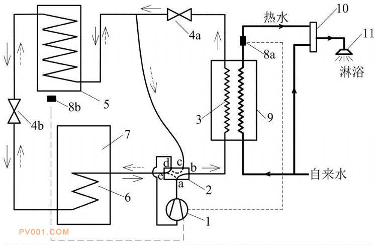 专利摘要:公开(公告)日:2020-05-15摘要:本发明提出了一种太阳能即热热泵热水器,所述热泵热水器包括:太阳能装置、带有五通换向阀的热泵循环系统和热水换热器;太阳能装置串接在热泵循环系统中供热膨胀阀与储热膨胀阀之间的管路上;热泵循环系统的冷凝器设置在所述热水换热器的内部;通过五通换向阀切换所述热泵循环系统的循环路径。本发明在洗浴时,将热泵循环系统切换至供热循环路径,利用热泵循环系统对热水换热器的水进行快速加热,实现即热,当不洗浴时,将热泵循环系统切换至储热循环路径,利用太阳能集热器及热泵循环系统对冷水箱内的工质进行加热,降低了太阳能集热器的集热温度,实现太阳能的有效利用,使太阳能热集热器的运行费率进一步降低,且规避了加热速度慢的技术缺陷。