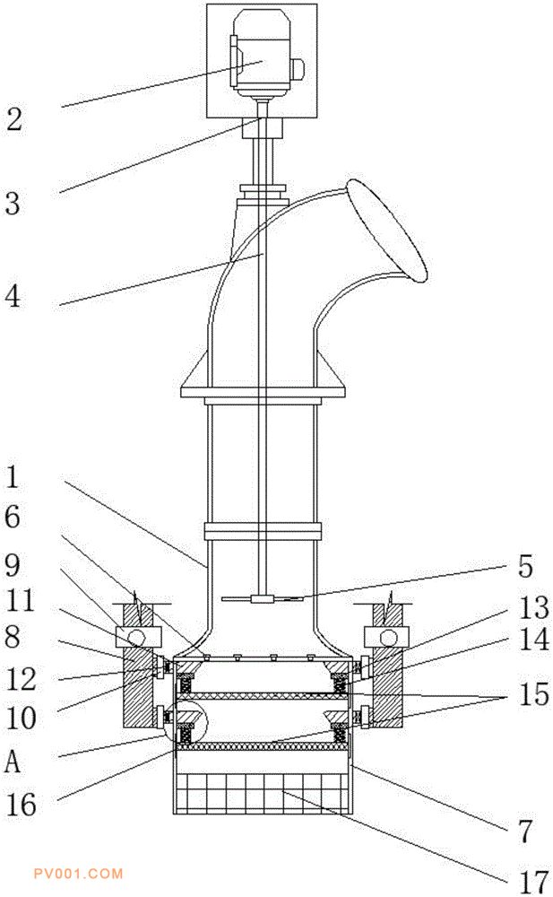 水泵外壳和螺纹空心连接件,所述流式水泵外壳上侧左端设置有电机,且电机通过电机轴转动连接有转轴,同时转轴下侧固定有叶轮片,所述流式水泵外壳通过螺栓螺纹连接有过滤器外壳,所述螺纹空心连接件一端螺纹连接有第一进水管,所述过滤器外壳左右两侧均贯穿有第二进水管,所述固定块上侧设置有第二进水管,所述过滤器外壳左右内壁上开设有滑道,所述过滤器外壳的下侧设置有进水口。该一种轴流式水泵的过滤结构,设置有弹簧轴、过滤网和滑道,两层过滤网的设置将杂质过滤更加彻底,并且过滤网在弹簧轴的作用下上下加大晃动,减少杂质吸附在过滤网上。