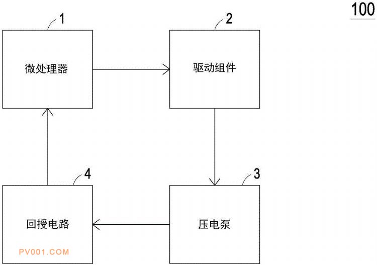 专利摘要:公开(公告)日:2020-05-19摘要:一种微型压电泵模块,包含压电泵、微处理器、驱动组件以及回授电路。压电泵于一理想工作电压运作时具有最佳效能。驱动组件电连接微处理器及压电泵,且包含变压件及逆变件,其中变压件输出有效工作电压至压电泵,逆变件控制压电泵的第一电极与第二电极接收有效工作电压或接地,使压电泵的压电件因压电效应产生形变,用以输送流体。回授电路电连接于压电泵与微处理器之间,接收压电泵输出的有效工作电压,并产生回授电压至微处理器,以供微处理器调整变压件输出的有效工作电压趋近理想工作电压。