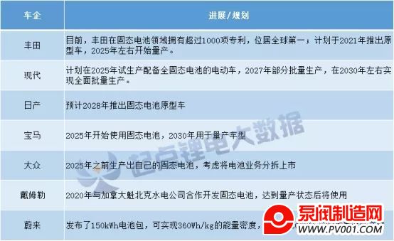 而对于车企而言,电池是电动车的核心,如今市场格局下,车企已经被动力电池企业“卡脖子”已久。主要车企相继宣布建厂造电池,固态电池正是夺回主动权的大好机会。目前国外如丰田、现代、日产、宝马、大众、戴姆勒,国内如蔚来等车企均有布局。
