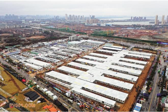 这是继火神山医院之后,武汉新建的第二个北京小汤山模式专门医院,位于江夏区黄家湖,整体参照战地医院形式,总用地面积约328亩,建筑面积7.9万平方米。医疗用房区为一层结构,共有1500张床位;医护人员生活区包含10栋建筑,共计可住宿2000余人。其中医护宿舍有7栋楼,每栋各两层,共计264个房间,每个房间里摆放着3张高低床(6个床位),安装了空调、电视机等电器,有单独的卫生间、淋浴室等。1栋专家楼、2栋后勤保障楼主体结构已完成。