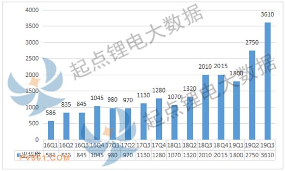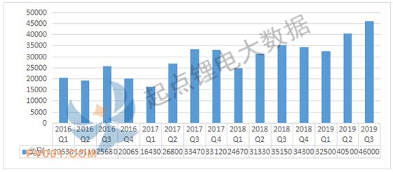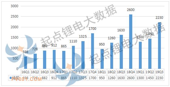 2019年第三季度,磷酸铁锂出货量为1.7吨万,同比增长41%,环比21%,19年磷酸铁锂行业龙头效应凸显,行业走向集中,原先小规模企业和没有大资本背景的企业面临停产,开始大批量清理库存,调整方向,形成行业大头出货增长,小企业倒闭局面。同时随着储能领域的发展,磷酸铁锂市场需求增加,因此总体出货量增长。
