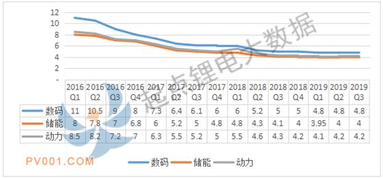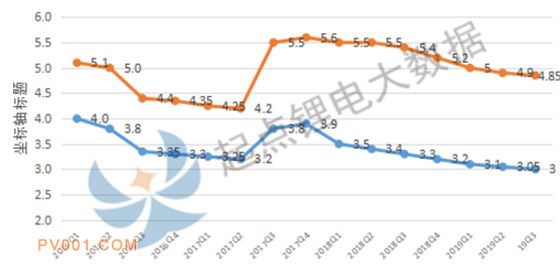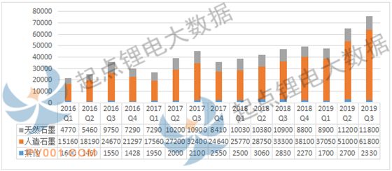 2019年Q3,负极材料价格基本维持平稳,天然石墨类小幅度下滑;人造石墨类与天然石墨一样,价格小幅度下滑。