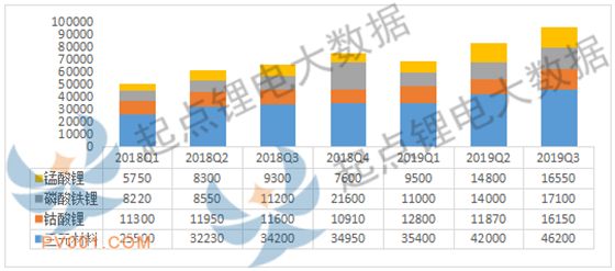 图16:2018~2019年Q3中国正极细分材料领域产量(吨)