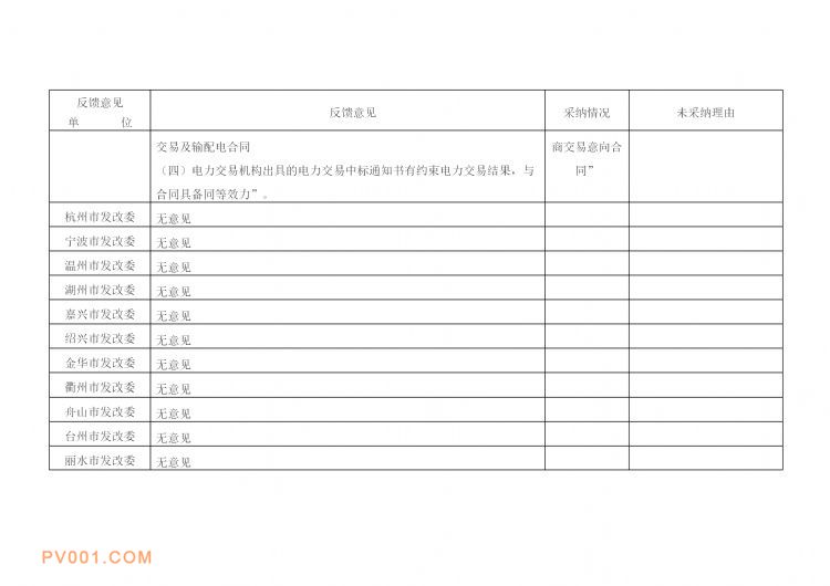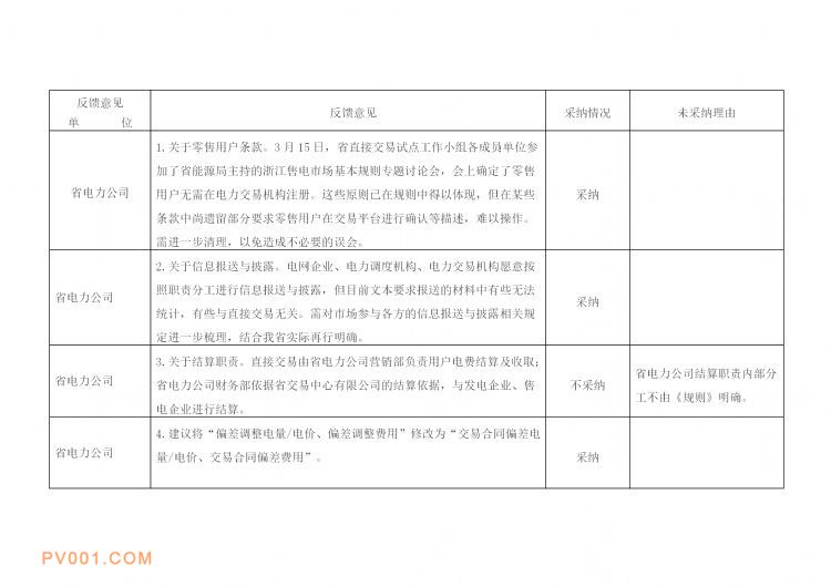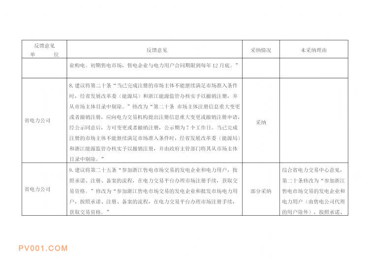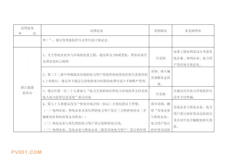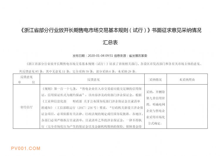 近日获悉,日前浙江省发改委发布《浙江省部分行业放开长期售电市场交易基本规则(试行)》书面征求意见采纳情况汇总表,共反馈意见85条,其中无意见11条,完全采纳39条,部分采纳6条,未采纳29条。