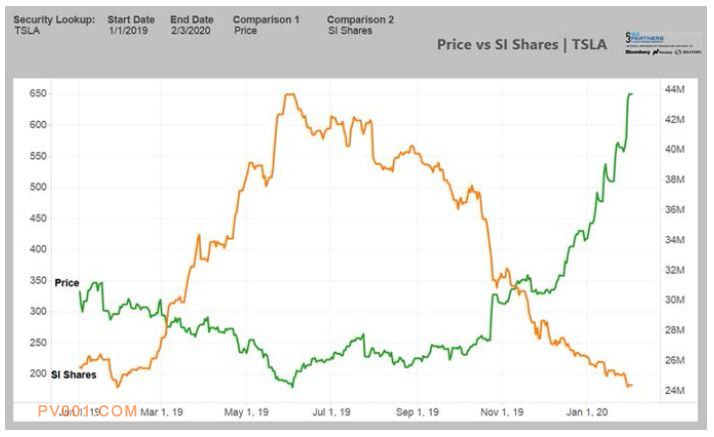 如果只是一份漂亮的财报,显然还不至于让特斯拉在几天之内从600美元爬向1000美元的“非理性”股价。要知道,在此之前,从200美元上涨到800美元,特斯拉花了半年时间。转折点发生在2月3日,也就是发出四季报、宣布达成全年交付目标的的下一个交易日。股价大幅上升逼迫空头们平仓,他们不得不购入股票还给银行,而他们的买入行为又反过来推高股价,使更多空头被迫平仓,循环往复。这被称为逼空或轧空头,是特斯拉股价疯涨的主要原因。