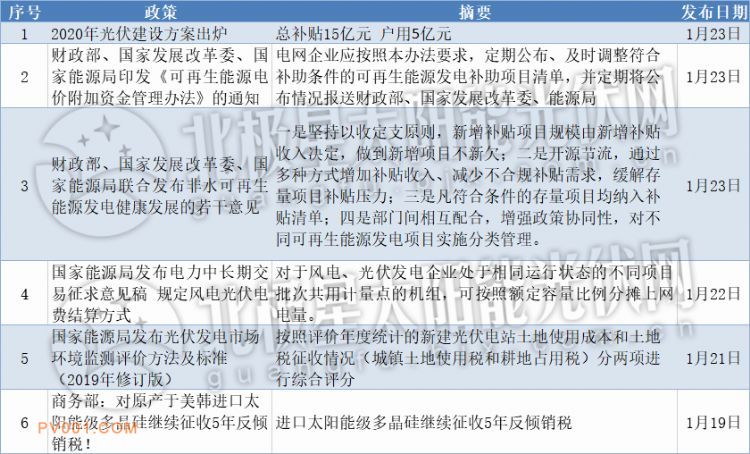 光伏行业是一个政策导向型行业,政策对行业的影响至关重要,近日将2020年1月与光伏相关政策进行了汇总,以飨读者。