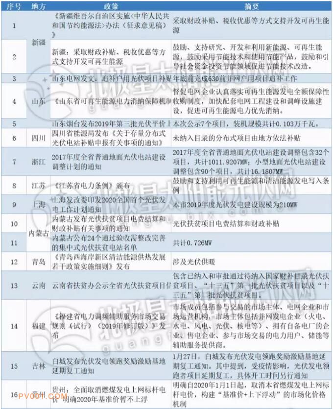 整个1月共计14个省份出台了18项光伏相关政策,如新疆、山东、四川、江苏、上海、内蒙古、青岛、云南、福建、吉林、贵州、河北。