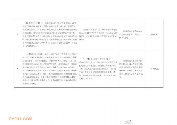 爱康科技认为,2020年2月3日,爱康科技披露《关于2019年度业绩预告的公告》,预计2019年度归属于上市公司股东的净利润为亏损12亿元至17亿元,亏损原因主要包括与光伏电站业务相关资产减值、联营企业爱康能源工程公司因光伏政策原因产生经营亏损及资产减值等而导致的对其长期股权投资权益法核算亏损及减值、青海蓓翔电站因限电损失增加而调整股权转让对价导致的股权转让款损失,对外担保导致或有损失等。