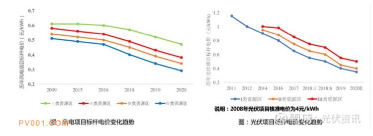 2019年之前,风电和光伏项目采用标杆电价政策,标杆电价逐年下降;不同时间并网的项目电价不同,具体如下图所示;