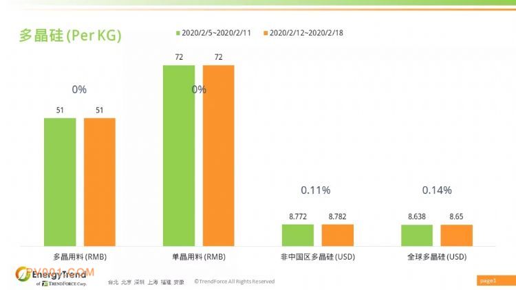 2020年2月12日的最新报价,大陆多晶用料价格维持在 RMB51/KG;单晶用料价格维持在 RMB72/KG。非中国区多晶硅料从 US$8.772/KG 小幅上涨 0.11% 来到 US$8.782/KG;全球多晶硅料的最新均价为 US$8.65/KG,比之前的 US$8.638/KG 增加了 0.14%。