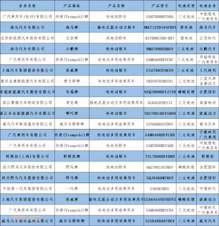 在申报的20款新能源乘用车中,纯电动车型17款,插电式混动乘用车型3款。从动力电池技术路线来看,三元电池有15款,锂离子电池(未注明类型)2款、磷酸铁锂电池3款。