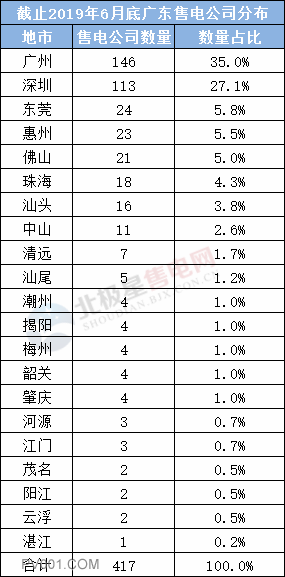 截至2020年2月底,广东准入市场的发电企业95家,大用户776家,一般用户17447,售电公司438家,售电公司较2018年底增长6.3%。虽然广东的2019年年度电力市场报告未公布,不过从2019年半年度的情况来看,广州深圳两地的售电公司数量居多,占全省总数量的62.1%,交易电量和收益总额的市场份额均超过7成。
